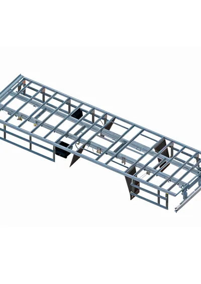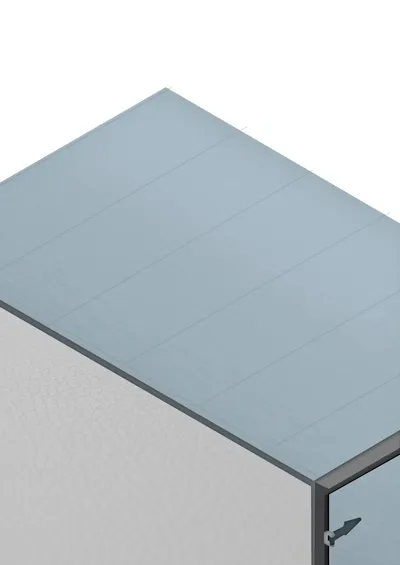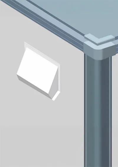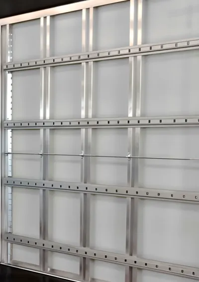 Estrutura externa dos painéis em perfis de alumínio e colunas internas em perfis de aço galvanizado.